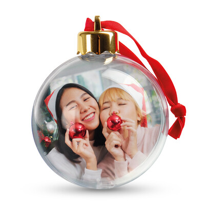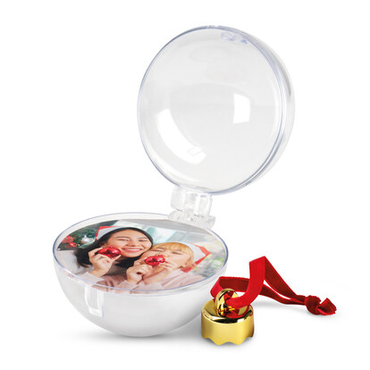 Foto-Weihnachtskugel aus Kunststoff inkl. rotem Samtband zum Aufhängen. Die Einsatzmöglichkeit dieser Fotokugel sind vielfältig. Sie kann nicht nur als Christbaumkugel, sondern auch als Accessoire für den Adventskalender oder als Gutschein verwendet werden. Einfach ein Foto oder ein Firmenlogo auf Fotopapier ausdrucken und in das Innere der transparenten Weihnachtskugel stecken. Es können 2 verschiedene Fotos auf Vorder- und Rückseite der Kugel gezeigt werden.
