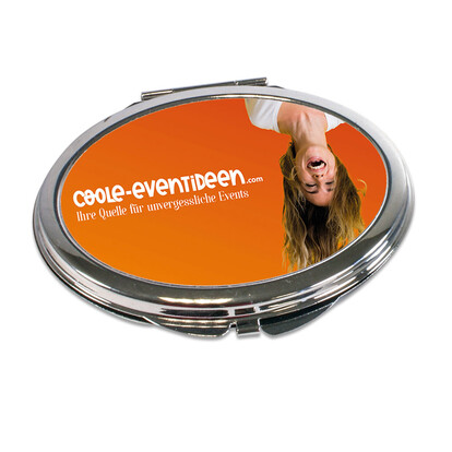 Der Spiegel im Handtaschenformat passt mit seinen Maßen von 60 x 60 mm (quadratisch) und 70 x 62 mm (oval) in jede Frauentasche. Besonders exklusiv wirkt der Handspiegel mit Foto dank seiner Versilberung. Die persönliche Note erhält der Handtaschenspiegel durch ein eingedrucktes Foto nach Wahl und ist ein hübsches Geschenk und Mitbringsel für viele Anlässe. Der Handtaschenspiegel kann auch als Werbeträger genutzt werden.
