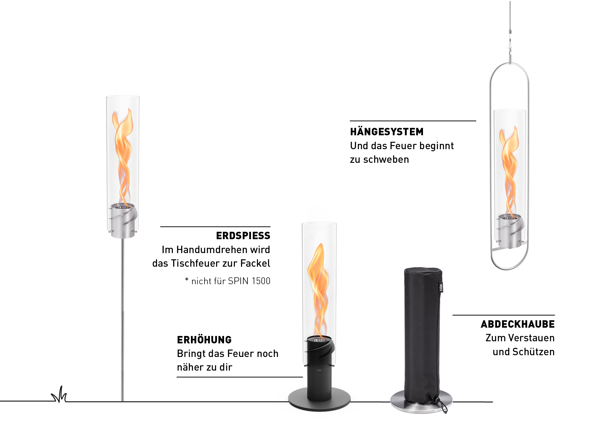SPIN hinterlässt einen nachhaltigen Eindruck - als Tischfeuer, auf dem Boden stehend, als Gartenfackel (nur SPIN 900|1200) und auch als schwebendes Hängefeuer. Das zahlreich prämierte Designprodukt schenkt dir kreativen Freiraum und dank umfassendem Zubehörsortiment findest du für jeden Anlass den passenden Flammenwirbel.