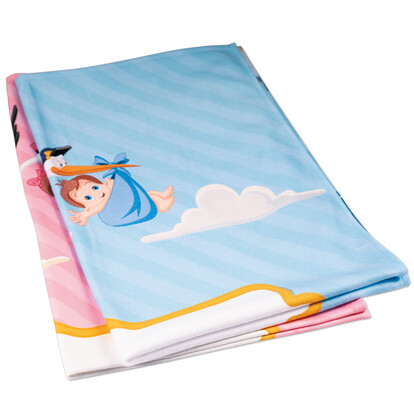 Ein praktisches Geschenk für frischgebackene Eltern, die ihren Nachwuchs kuschelig einwickeln wollen! Die Mikrofaser Fleece-Decken sind schon partiell mit einem zur Geburt passenden Motiv vorbedruckt. Die einseitig bedruckbaren Decken sind zu 100% aus Polyester.