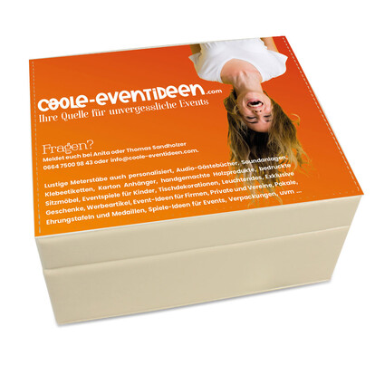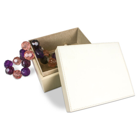 Unsere schmucke Box! Edel in Endform: Diese hochwertige Box mit abnehmbarem Deckel passt in jeden geschmackvoll eingerichteten Haushalt. Die Kunstlederschatulle ist in dezentem Creme-Ton gehalten und passt somit überall hin. Die Oberseite des Deckels ist bedruckbar. TIPP: Ein Foto in Sepia passt hervorragend zu den Farben der Box. Der Innenteil der Box ist mit beigem Veloursleder ausgeschlagen.