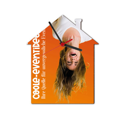 Die Wanduhr in Form eines Hauses mit Sublistar® Coating ist eine außergewöhnliche Geschenkidee. Sie verschönert jeden Wohnraum ganz individuell und charmant. Vollflächig bedruckbar und hervorragend geeignet als Geschenk zur Einweihung der neuen Wohnung oder für frischgebackene Ehepaare. Die sehr präzise Verarbeitung und die hochglänzende Oberfläche geben dieser Uhr den letzten Schliff.